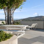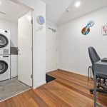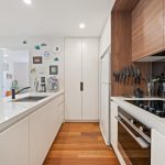 Inside, the mood is warm and pared back. Light color floorboards brings richness through the open-plan living space, while the kitchen feels quietly refined with its stone surfaces, clean lines, generous storage and oversized island bench at the centre of it all. Full-height glass draws in the light and creates an effortless connection to the outdoors, giving the apartment a lovely sense of openness.